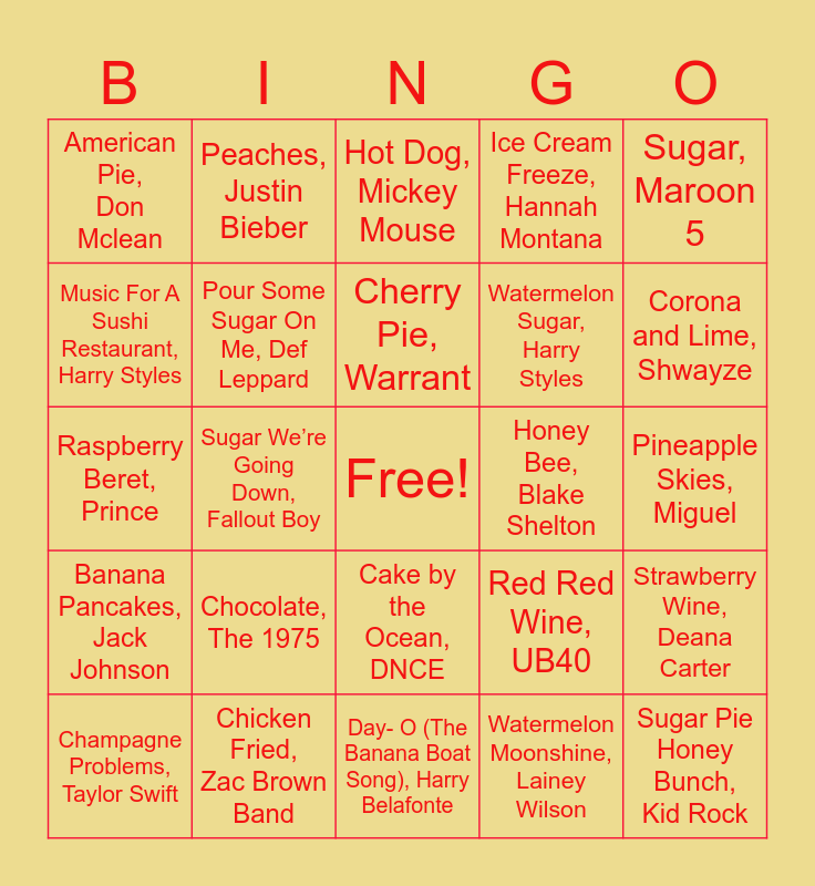 This bingo card has a free space and 27 words: Red Red Wine, UB40, The Chicken Dance, #1 Party Band, Watermelon Sugar, Harry Styles, Day- O (The Banana Boat Song), Harry Belafonte, Music For A Sushi Restaurant, Harry Styles, Hot Dog, Mickey Mouse, Peaches, Justin Bieber, Banana Pancakes, Jack Johnson, Honey Bee, Blake Shelton, Strawberry Wine, Deana Carter, Raspberry Beret, Prince, Ice Cream Freeze, Hannah Montana, Champagne Problems, Taylor Swift, Chicken Fried, Zac Brown Band, Corona and Lime, Shwayze, Honey, Honey, ABBA, Pour Some Sugar On Me, Def Leppard, Cherry Pie, Warrant, Chocolate, The 1975, American Pie, Don Mclean, Pineapple Skies, Miguel, Watermelon Moonshine, Lainey Wilson, Sugar We’re Going Down, Fallout Boy, Sugar Pie Honey Bunch, Kid Rock, Cake by the Ocean, DNCE, Sugar, Maroon 5 and Cheeseburger in Paradise, Jimmy Buffet.