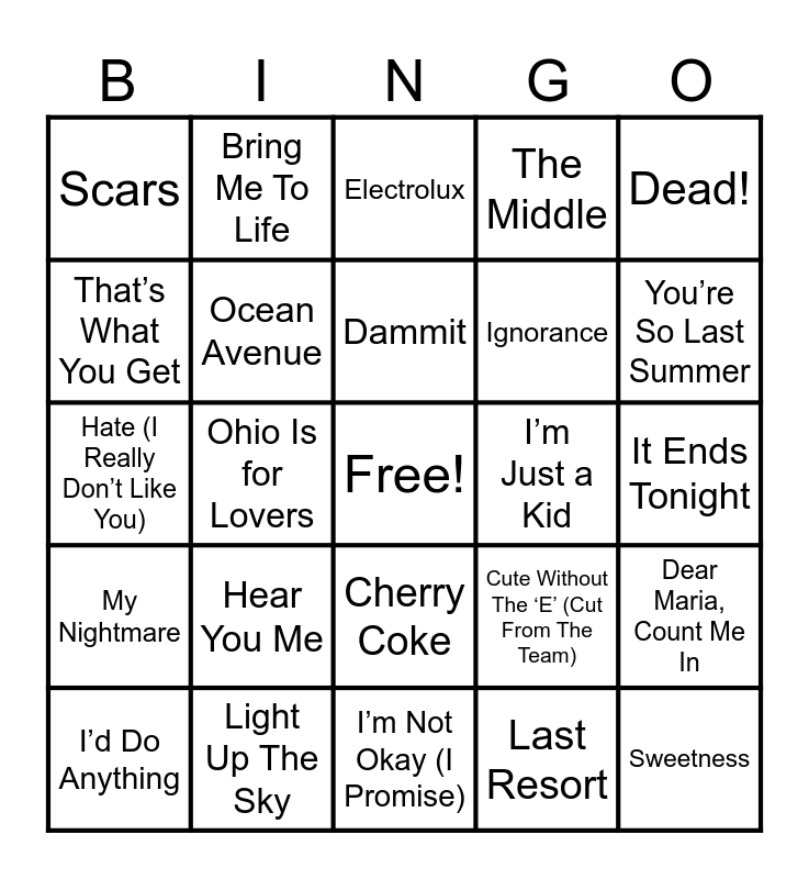 This bingo card has a free space and 50 words: Sugar, We’re Goin Down, Sweetness, Misery Business, I’m Not Okay (I Promise), Hear You Me, I Write Sins Not Tragedies, Bring Me To Life, Welcome to the Black Parade, That’s What You Get, Numb, Ocean Avenue, The Middle, Dear Maria, Count Me In, Cute Without The ‘E’ (Cut From The Team), Alive With the Glory of Love, Grand Theft Autumn / Where Is Your Boy, Dammit, I’m Just a Kid, Flavor Of The Weak, Dead!, Ohio Is for Lovers, Last Resort, Scars, Ignorance, Becoming the Bull, I’m So Sick, You’re So Last Summer, Sometimes, Electrolux, Cherry Coke, Growing, Killing A Camera, Blister, Claire, Light Up The Sky, The Reason, I Miss You, Thanks fr th Mmrs, Hero / Heroine, It Ends Tonight, Nine in the Afternoon, The Taste of Ink, I Melt With You, Memory, I’d Do Anything, Hate (I Really Don’t Like You), This Ain’t A Scene, It’s An Arms Race, The Black, My Nightmare and All Around Me.
