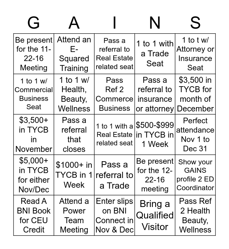 This bingo card has a free space and 24 words: $1000+ in TYCB in 1 Week, Attend a Power Team Meeting, Pass Ref 2 Commerce Business, Read A BNI Book for CEU Credit, 1 to t w/ Attorney or Insurance Seat, Be present for the 11-22-16 Meeting, 1 to 1 w/ Commercial Business Seat, Attend an E-Squared Training, $500-$999 in TYCB in 1 Week, Pass a referral to a Trade, Pass a referral to insurance or attorney, $3,500+ in TYCB in November, Be present for the 12-22-16 meeting, Show your GAINS profile 2 ED Coordinator, 1 to 1 w/ Health, Beauty, Wellness, Bring a Qualified Visitor, Perfect attendance Nov 1 to Dec 31, Pass a referral to Real Estate related seat, $3,500 in TYCB for month of December, Pass a referral that closes, Pass Ref 2 Health Beauty, Wellness, $5,000+ in TYCB for either Nov/Dec, 1 to 1 with a Trade Seat and Enter slips on BNI Connect in Nov & Dec.