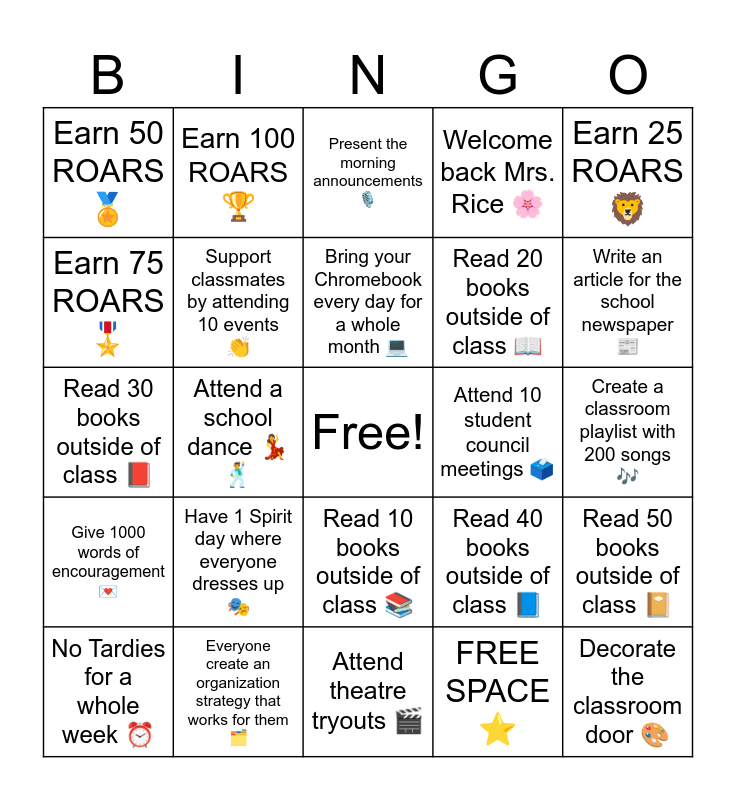 This bingo card has a free space and 25 words: Have 1 Spirit day where everyone dresses up 🎭, Attend theatre tryouts 🎬, Bring your Chromebook every day for a whole month 💻, No Tardies for a whole week ⏰, Earn 25 ROARS 🦁, Earn 50 ROARS 🏅, Earn 75 ROARS 🎖️, Earn 100 ROARS 🏆, Attend 10 student council meetings 🗳️, Read 10 books outside of class 📚, Read 20 books outside of class 📖, Read 30 books outside of class 📕, Read 40 books outside of class 📘, Read 50 books outside of class 📔, Support classmates by attending 10 events 👏, Everyone present one topic that interests them to the class (Teacher for a Day) 🎤, Create a classroom playlist with 200 songs 🎶, Present the morning announcements 🎙️, Write an article for the school newspaper 📰, Attend a school dance 💃🕺, Decorate the classroom door 🎨, Everyone create an organization strategy that works for them 🗂️, Give 1000 words of encouragement 💌, Welcome back Mrs. Rice 🌸 and FREE SPACE ⭐.