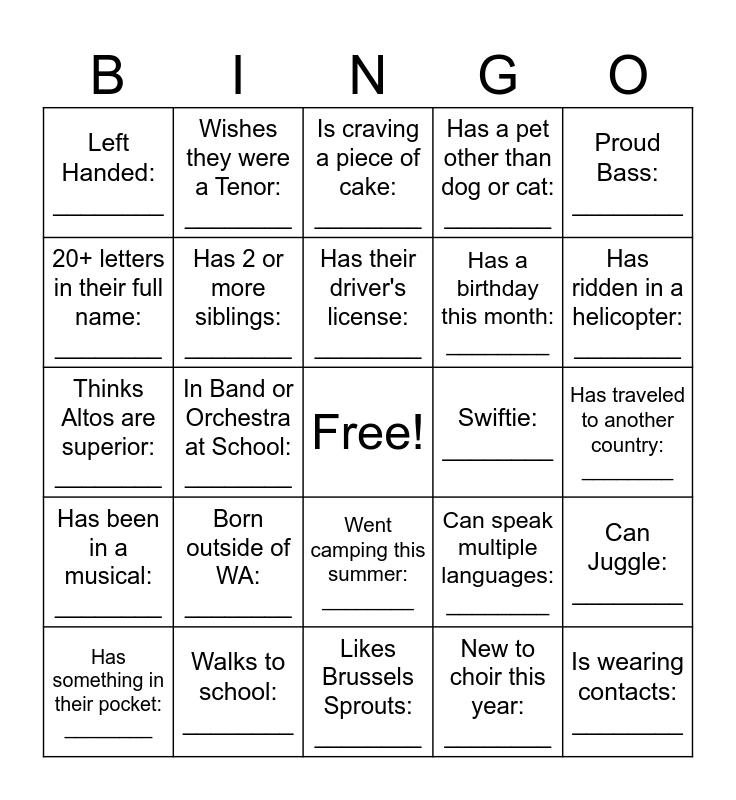 This bingo card has a free space and 30 words: Walks to school: ________, Soprano for life: : ________, In Band or Orchestra at School: ________, Wearing red: ________, Left Handed: ________, Is craving a piece of cake: ________, Has 2 or more siblings: ________, Went camping this summer: ________, Swiftie: ________, Likes Brussels Sprouts: ________, Has traveled to another country: ________, Is wearing contacts: ________, New to choir this year: ________, Plays a sport at school: ________, Has ridden in a helicopter: ________, Senior who's been in choir all 4 years: ________, Can speak multiple languages: ________, Has been in a musical: ________, Born outside of WA: ________, Proud Bass: ________, Thinks Altos are superior: ________, Plays piano: ________, Wishes they were a Tenor: ________, Has a birthday this month: ________, 20+ letters in their full name: ________, Has a pet other than dog or cat: ________, Can Juggle: ________, Has something in their pocket: ________, Has their driver's license: ________ and Got at least 8hrs of sleep last night: ________.