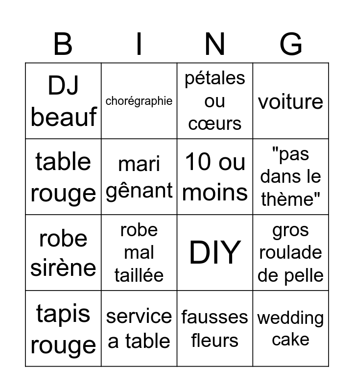 This bingo card has 16 words: service a table, gros roulade de pelle, pétales ou cœurs, DJ beauf, robe sirène, chorégraphie, DIY, fausses fleurs, table rouge, mari gênant, tapis rouge, voiture, robe mal taillée, "pas dans le thème", 10 ou moins and wedding cake.