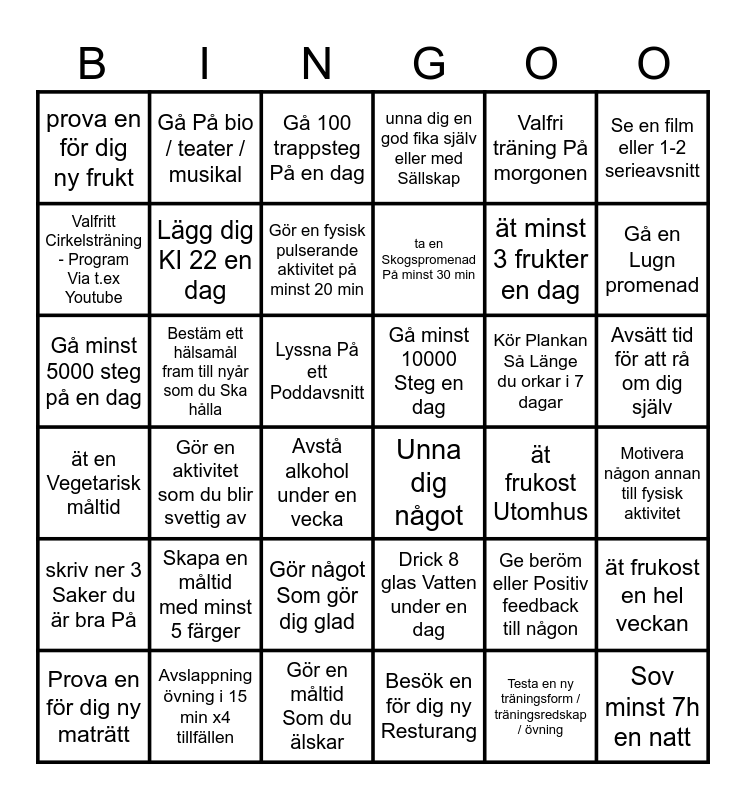This bingo card has 36 words: Drick 8 glas Vatten under en dag, Gör något Som gör dig glad, Besök en för dig ny Resturang, Valfritt Cirkelsträning - Program Via t.ex Youtube, ät en Vegetarisk måltid, Gå minst 10000 Steg en dag, Lägg dig KI 22 en dag, Gör en måltid Som du älskar, Valfri träning På morgonen, Ge beröm eller Positiv feedback till någon, Gå en Lugn promenad, unna dig en god fika själv eller med Sällskap, ät frukost en hel veckan, Bestäm ett hälsamål fram till nyår som du Ska hålla, ta en Skogspromenad På minst 30 min, prova en för dig ny frukt, skriv ner 3 Saker du är bra På, Kör Plankan Så Länge du orkar i 7 dagar, Gå minst 5000 steg på en dag, Gå 100 trappsteg På en dag, Lyssna På ett Poddavsnitt, Gör en aktivitet som du blir svettig av, Unna dig något, Avstå alkohol under en vecka, ät frukost Utomhus, Gå På bio / teater / musikal, ät minst 3 frukter en dag, Avslappning övning i 15 min x4 tillfällen, Gör en fysisk pulserande aktivitet på minst 20 min, Se en film eller 1-2 serieavsnitt, Sov minst 7h en natt, Prova en för dig ny maträtt, Motivera någon annan till fysisk aktivitet, Avsätt tid för att rå om dig själv, Skapa en måltid med minst 5 färger and Testa en ny träningsform / träningsredskap / övning.