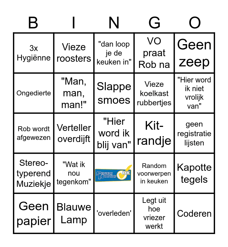 This bingo card has 1 images and 34 words: Witte jas aan!, Opmerking uiterlijk, "Kansloos", Vieze koelkast rubbertjes, Coderen, 3x Hygiënne, "Man, man, man!", Vieze borden, Kit-randje, Schimmel, Rob wordt afgewezen, Vieze roosters, Prullenbak met/zonder deksel, Geen zeep, Stereo-typerend Muziekje, Blauwe Lamp, "dan loop je de keuken in", Legt uit hoe vriezer werkt, geen registratie lijsten, Geen papier, Verteller overdijft, "Hier word ik blij van", Snijplankie, "Hier word ik niet vrolijk van", Ongedierte, Kalkaanslag, 'overleden', Random voorwerpen in keuken, Kapotte tegels, 2e bezoek, "Wat ik nou tegenkom", Slappe smoes, VO praat Rob na and Vieze doekjes.