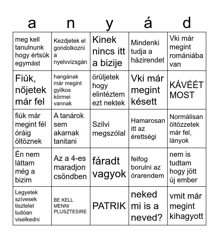 This bingo card has a free space and 24 words: Az a 4-es maradjon csöndben, BE KELL MENNI PLUSZTESIRE, örüljetek hogy elintéztem ezt nektek, Legyetek szívesek tisztelet tudóan viselkedni, Vki már megint romániába van, meg kell tanulnunk hogy értsük egymást, Fiúk, nőjetek már fel, Kezdjetek el gondolkozni a nyelvvizsgán, Hamarosan itt az érettségi, fáradt vagyok, Vki már megint késett, fiúk már megint fél óráig öltöznek, felfog borulni az órarendem, nem is tudtam hogy jött új ember, hangának már megint gyilkos körmei vannak, neked mi is a neved?, Normálisan öltözzetek már fel, lányok, Kinek nincs itt a bizije, KÁVÉÉT MOST, A tanárok sem akarnak tanitani, vmit már megint kihagyott, Én nem láttam még a bizim, Mindenki tudja a házirendet and PATRIK.
