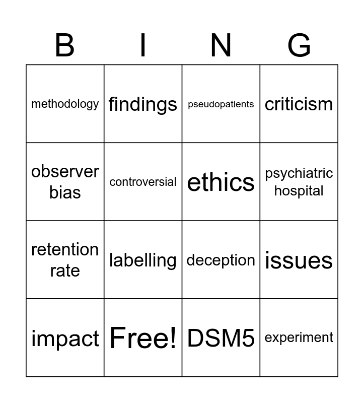 This bingo card has 29 words: validity, reliability, issues, socially sensitive research, methodology, pseudopatients, ethics, significance, Free!, MAOA Gene, DSM5, impact, observation, diagnosis, labelling, longitudinal, case study, experiment, observer bias, deception, researcher, confidentiality, retention rate, controversial, criticism, findings, agression, psychiatric hospital and internal validity.