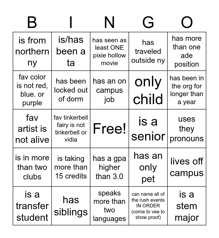 This bingo card has a free space and 24 words: is taking more than 15 credits, has siblings, has an on campus job, is a transfer student, has more than one ade position, is from northern ny, fav color is not red, blue. or purple, is/has been a ta, is a senior, has a gpa higher than 3.0, only child, fav artist is not alive, has an only pet, lives off campus, has been locked out of dorm, can name all of the rush events IN ORDER (come to vee to show proof), uses they pronouns, has seen as least ONE pixie hollow movie, has been in the org for longer than a year, fav tinkerbell fairy is not tinkerbell or vidia, is a stem major, is in more than two clubs, has traveled outside ny and speaks more than two languages.