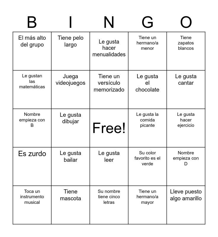 This bingo card has a free space and 29 words: Toca un instrumento musical, Le gusta pizza con piña, Le gusta dibujar, Cumple años el mismo mes que tú, El más alto del grupo, Le gusta hacer menualidades, Juega videojuegos, Le gusta bailar, Le gusta la comida picante, Tiene mascota, Le gusta hacer ejercicio, Lleve puesto algo amarillo, Su nombre tiene cinco letras, Tiene un hermano/a mayor, Le gusta cantar, Sabe nadar, Le gusta leer, Es zurdo, Tiene zapatos blancos, Nombre empieza con B, Su color favorito es el verde, Le gusta películas románticas, Le gusta el chocolate, Le gustan las matemáticas, Tiene un hermano/a menor, Tiene pelo largo, Nombre empieza con D, Tiene un versículo memorizado and Le gusta usar emojis.