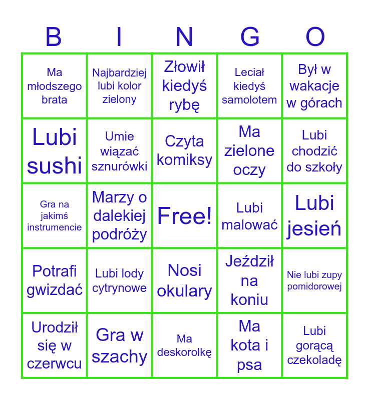 This bingo card has a free space and 24 words: Lubi lody cytrynowe, Gra w szachy, Czyta komiksy, Urodził się w czerwcu, Był w wakacje w górach, Ma młodszego brata, Lubi sushi, Najbardziej lubi kolor zielony, Lubi malować, Nosi okulary, Ma zielone oczy, Gra na jakimś instrumencie, Jeździł na koniu, Nie lubi zupy pomidorowej, Umie wiązać sznurówki, Ma kota i psa, Lubi jesień, Złowił kiedyś rybę, Lubi chodzić do szkoły, Marzy o dalekiej podróży, Lubi gorącą czekoladę, Potrafi gwizdać, Leciał kiedyś samolotem and Ma deskorolkę.