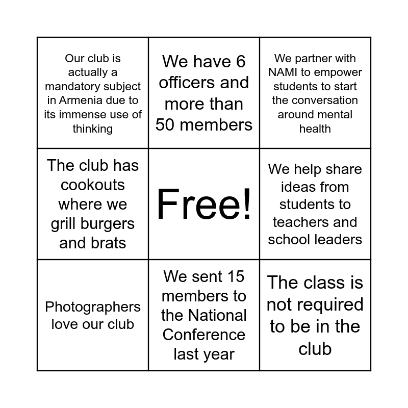 This bingo card has a free space and 8 words: We help share ideas from students to teachers and school leaders, We partner with NAMI to empower students to start the conversation around mental health, We have 6 officers and more than 50 members, Photographers love our club, Our club is actually a mandatory subject in Armenia due to its immense use of thinking, The class is not required to be in the club, The club has cookouts where we grill burgers and brats and We sent 15 members to the National Conference last year.