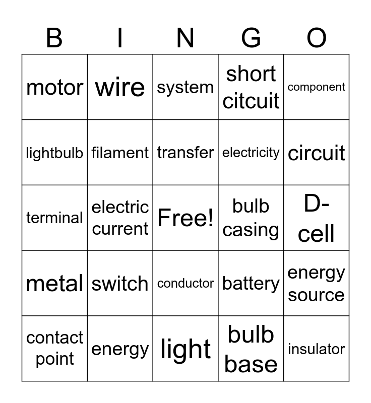 This bingo card has a free space and 24 words: switch, energy, transfer, contact point, component, motor, lightbulb, wire, bulb casing, conductor, electricity, terminal, battery, energy source, filament, bulb base, D-cell, system, circuit, electric current, insulator, metal, short citcuit and light.