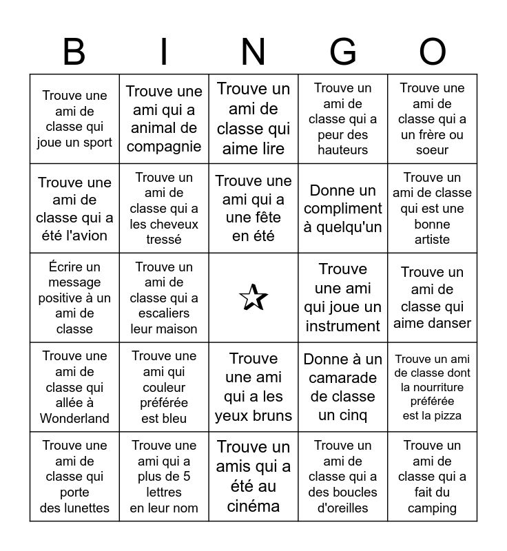 This bingo card has a free space and 24 words: Trouve une ami qui couleur préférée est bleu, Trouve une ami qui a plus de 5 lettres en leur nom, Trouve une ami qui a une fête en été, Trouve une ami de classe qui porte des lunettes, Trouve une ami de classe qui a un frère ou soeur, Trouve une ami de classe qui joue un sport, Trouve une ami de classe qui a été l'avion, Trouve une ami qui a animal de compagnie, Trouve une ami qui joue un instrument, Trouve une ami qui a les yeux bruns, Donne un compliment à quelqu'un, Écrire un message positive à un ami de classe, Donne à un camarade de classe un cinq, Trouve un ami de classe dont la nourriture préférée est la pizza, Trouve un ami de classe qui a les cheveux tressé, Trouve un ami de classe qui a des boucles d'oreilles, Trouve un ami de classe qui aime danser, Trouve un ami de classe qui aime lire, Trouve un ami de classe qui est une bonne artiste, Trouve un ami de classe qui a escaliers leur maison, Trouve un ami de classe qui a fait du camping, Trouve une ami de classe qui allée à Wonderland, Trouve un ami de classe qui a peur des hauteurs and Trouve un amis qui a été au cinéma.
