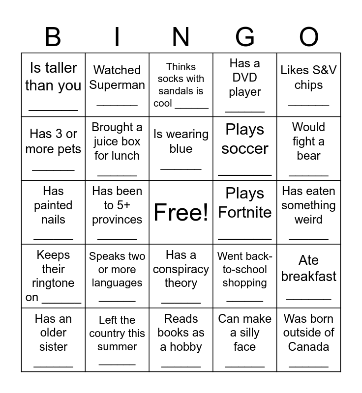 This bingo card has a free space and 24 words: Speaks two or more languages ______, Left the country this summer ______, Is wearing blue ______, Has an older sister ______, Likes S&V chips ______, Is taller than you ______, Has 3 or more pets ______, Watched Superman ______, Plays Fortnite ______, Has a conspiracy theory ______, Plays soccer ______, Has painted nails ______, Went back-to-school shopping ______, Ate breakfast ______, Brought a juice box for lunch ______, Can make a silly face ______, Has eaten something weird ______, Thinks socks with sandals is cool ______, Would fight a bear ______, Has been to 5+ provinces ______, Was born outside of Canada ______, Keeps their ringtone on ______, Has a DVD player ______ and Reads books as a hobby ______.