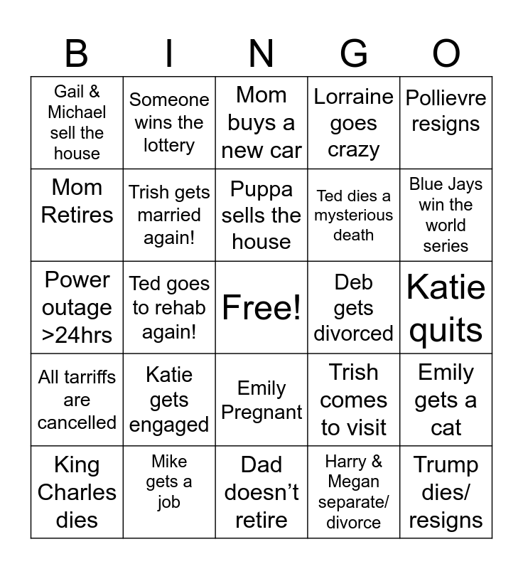 This bingo card has a free space and 24 words: Katie gets engaged, Mike gets a job, Puppa sells the house, King Charles dies, Pollievre resigns, Gail & Michael sell the house, Mom Retires, Someone wins the lottery, Deb gets divorced, Emily Pregnant, Ted dies a mysterious death, Power outage >24hrs, Trish comes to visit, Emily gets a cat, Trish gets married again!, Harry & Megan separate/ divorce, Katie quits, Mom buys a new car, Blue Jays win the world series, Ted goes to rehab again!, Trump dies/ resigns, All tarriffs are cancelled, Lorraine goes crazy and Dad doesn’t retire.