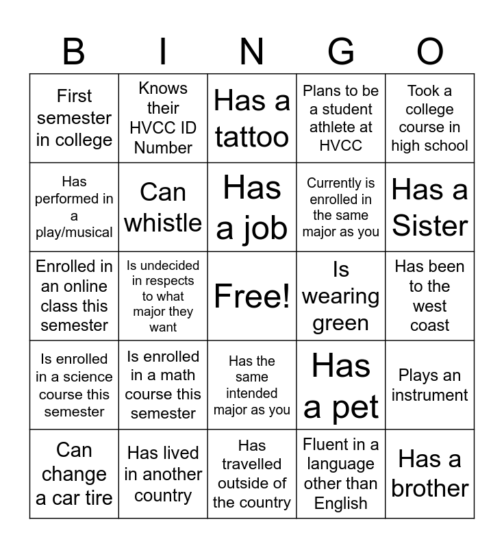 This bingo card has a free space and 24 words: Is enrolled in a math course this semester, Has lived in another country, Has a job, Can change a car tire, Took a college course in high school, First semester in college, Has performed in a play/musical, Knows their HVCC ID Number, Is wearing green, Has the same intended major as you, Currently is enrolled in the same major as you, Enrolled in an online class this semester, Has a pet, Plays an instrument, Can whistle, Fluent in a language other than English, Has been to the west coast, Has a tattoo, Has a Sister, Is undecided in respects to what major they want, Has a brother, Is enrolled in a science course this semester, Plans to be a student athlete at HVCC and Has travelled outside of the country.