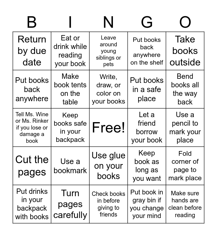 This bingo card has a free space and 24 words: Use a bookmark, Turn pages carefully, Write, draw, or color on your books, Put drinks in your backpack with books, Take books outside, Return by due date, Put books back anywhere, Eat or drink while reading your book, Let a friend borrow your book, Use glue on your books, Put books in a safe place, Tell Ms. Wine or Ms. Rinker if you lose or damage a book, Keep book as long as you want, Fold corner of page to mark place, Make book tents on the table, Put book in gray bin if you change your mind, Use a pencil to mark your place, Leave around young siblings or pets, Bend books all the way back, Keep books safe in your backpack, Make sure hands are clean before reading, Cut the pages, Put books back anywhere on the shelf and Check books in before giving to friends.