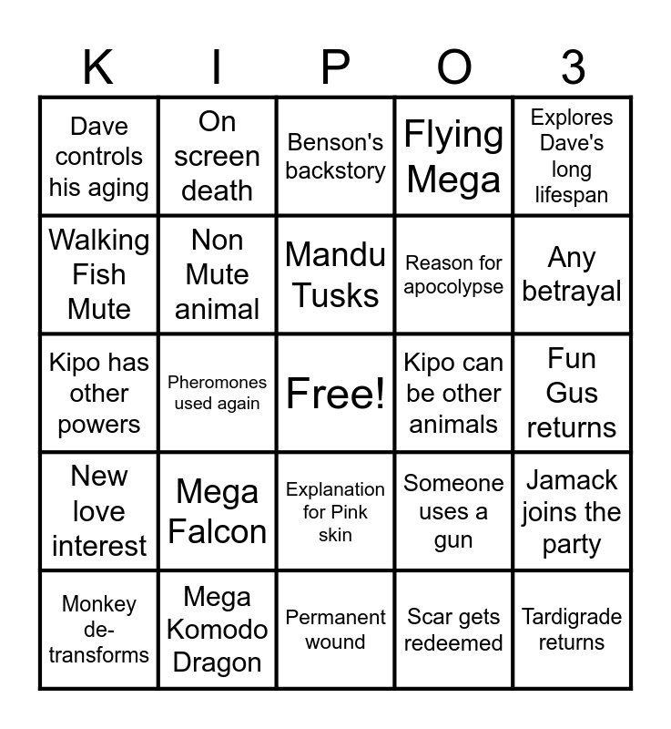 This bingo card has a free space and 24 words: Mega Falcon, Mega Komodo Dragon, Mandu Tusks, Monkey de-transforms, Explores Dave's long lifespan, Dave controls his aging, Walking Fish Mute, On screen death, Kipo can be other animals, Explanation for Pink skin, Reason for apocolypse, Kipo has other powers, Someone uses a gun, Jamack joins the party, Non Mute animal, Scar gets redeemed, Fun Gus returns, Benson's backstory, Any betrayal, Pheromones used again, Tardigrade returns, New love interest, Flying Mega and Permanent wound.