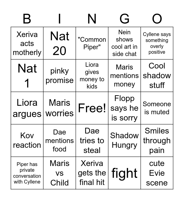 This bingo card has a free space and 24 words: Dae mentions food, Maris vs Child, Liora gives money to kids, Piper has private conversation with Cyllene, Cyllene says something overly positive, Xeriva acts motherly, Nat 1, Nat 20, Flopp says he is sorry, Dae tries to steal, Maris mentions money, Liora argues, Shadow Hungry, Smiles through pain, pinky promise, fight, Someone is muted, "Common Piper", Cool shadow stuff, Maris worries, cute Evie scene, Kov reaction, Nein shows cool art in side chat and Xeriva gets the final hit.