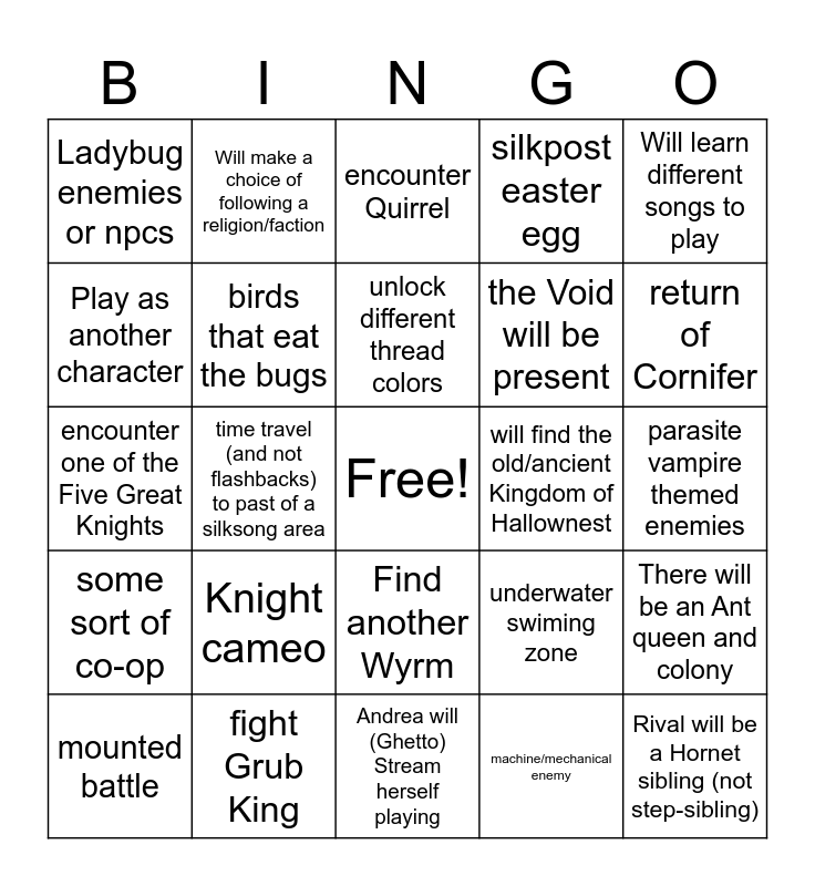 This bingo card has a free space and 24 words: Knight cameo, fight Grub King, unlock different thread colors, mounted battle, Will learn different songs to play, Ladybug enemies or npcs, Play as another character, Will make a choice of following a religion/faction, will find the old/ancient Kingdom of Hallownest, Find another Wyrm, the Void will be present, encounter one of the Five Great Knights, underwater swiming zone, There will be an Ant queen and colony, birds that eat the bugs, machine/mechanical enemy, parasite vampire themed enemies, encounter Quirrel, return of Cornifer, time travel (and not flashbacks) to past of a silksong area, Rival will be a Hornet sibling (not step-sibling), some sort of co-op, silkpost easter egg and Andrea will (Ghetto) Stream herself playing.