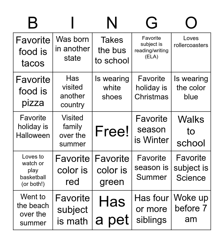 This bingo card has a free space and 24 words: Favorite color is red, Favorite subject is math, Is wearing white shoes, Went to the beach over the summer, Loves rollercoasters, Favorite food is tacos, Favorite food is pizza, Was born in another state, Favorite season is Winter, Favorite color is green, Favorite holiday is Christmas, Favorite holiday is Halloween, Favorite season is Summer, Favorite subject is Science, Has visited another country, Has four or more siblings, Walks to school, Takes the bus to school, Is wearing the color blue, Visited family over the summer, Woke up before 7 am, Loves to watch or play basketball (or both!), Favorite subject is reading/writing (ELA) and Has a pet.