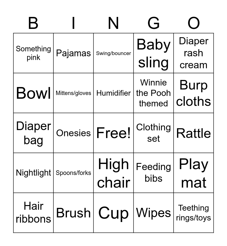 This bingo card has a free space and 50 words: Soap, Teething rings/toys, Plush toys, Cup, Spoons/forks, Swaddle, Pajamas, Lotion, Bowl, Musical toy, Mittens/gloves, Baby sling, Play mat, Feeding bibs, Baby blankets, Hat, Humidifier, Clothing set, Wash cloths, Diaper rash cream, Onesies, Wipes, Something pink, Winnie the Pooh themed, Laundry detergent, Bottles, Burp cloths, Pacifiers, Swing/bouncer, High chair, Hair bow, Halloween themed, Fall themed, Bath towel, Brush, Milestone, Shoes, Medicine, Pacifier clip, Rattle, Stroller, Crib mobile, Playpen, Bath toys, Hair ribbons, Diaper bag, Changing mat/table, Crib bedding, Nightlight and Baby plates.