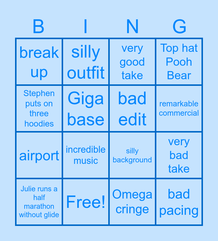 This bingo card has 16 words: Free!, very bad take, very good take, break up, airport, silly outfit, silly background, Omega cringe, Stephen puts on three hoodies, Giga base, Julie runs a half marathon without glide, Top hat Pooh Bear, incredible music, remarkable commercial, bad edit and bad pacing.