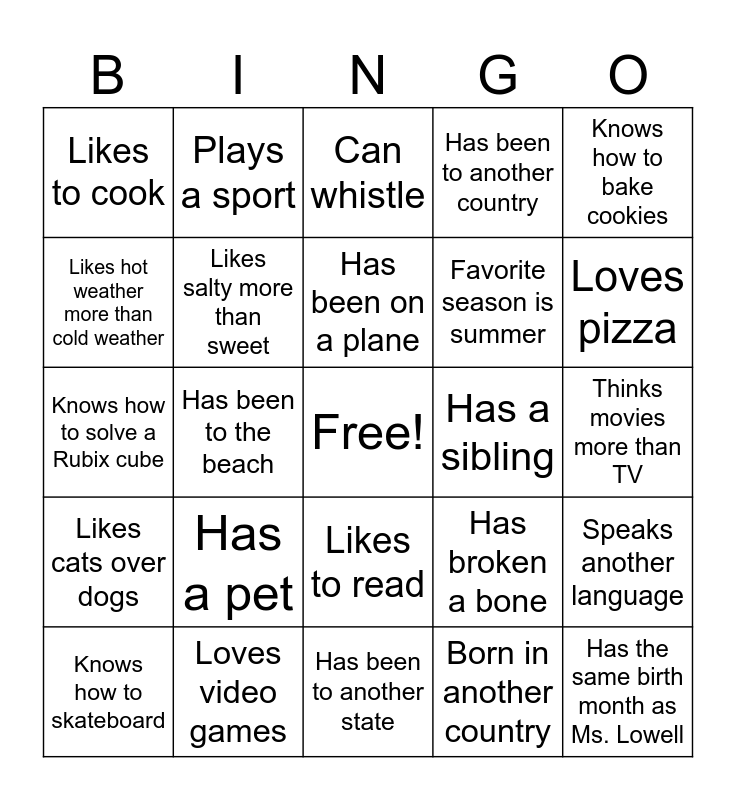 This bingo card has a free space and 24 words: Has a pet, Loves video games, Has been on a plane, Knows how to skateboard, Knows how to bake cookies, Likes to cook, Likes hot weather more than cold weather, Plays a sport, Has a sibling, Likes to read, Favorite season is summer, Knows how to solve a Rubix cube, Has broken a bone, Speaks another language, Likes salty more than sweet, Born in another country, Thinks movies more than TV, Can whistle, Loves pizza, Has been to the beach, Has the same birth month as Ms. Lowell, Likes cats over dogs, Has been to another country and Has been to another state.