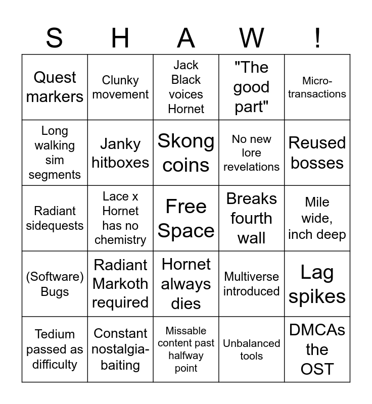 This bingo card has a free space and 24 words: Radiant Markoth required, Constant nostalgia-baiting, Skong coins, Tedium passed as difficulty, Micro-transactions, Quest markers, Long walking sim segments, Clunky movement, Breaks fourth wall, Hornet always dies, No new lore revelations, Radiant sidequests, Multiverse introduced, Lag spikes, Janky hitboxes, Unbalanced tools, Mile wide, inch deep, Jack Black voices Hornet, Reused bosses, Lace x Hornet has no chemistry, DMCAs the OST, (Software) Bugs, "The good part" and Missable content past halfway point.