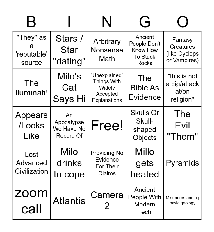 This bingo card has a free space and 40 words: Ancient Superstition Used as Proof of the Supernatural, Appears /Looks Like, Making Something Mundane Creepy, Milo's Cat Says Hi, Atlantis, Providing No Evidence For Their Claims, "Unexplained" Things With Widely Accepted Explanations, The Nazis Are Involved, Fantasy Creatures (like Cyclops or Vampires), Lost Advanced Civilization, An Apocalypse We Have No Record Of, Ancient People Don't Know How To Stack Rocks, Misunderstanding basic geology, The Evil "Them", Skulls Or Skull-shaped Objects, Milo drinks to cope, It's An Alien!, "They" as a 'reputable' source, Aliens Did It!, Arbitrary Nonsense Math, Pyramids, Ancient People With Modern Tech, The Bible As Evidence, The Iluminati!, Camra Glitch Or Issue, Mic Issue, Time skip to correct something, Pronunciation fun, Jon Franco/Team, Outfit change, wears his own merch, zoom call, Millo being a Ally, Millo gets heated, "this is not a dig/attack at/on religion", Camera 2, milo uses weird analogy, insults location, Stars / Star "dating" and Bellhop.
