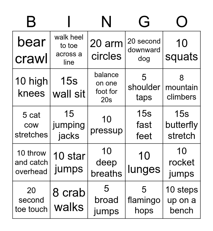 This bingo card has a free space and 24 words: 10 star jumps, 8 crab walks, balance on one foot for 20s, 20 second toe touch, 10 squats, bear crawl, 10 high knees, walk heel to toe across a line, 15s fast feet, 10 deep breaths, 5 shoulder taps, 5 cat cow stretches, 10 lunges, 10 rocket jumps, 15s wall sit, 5 flamingo hops, 15s butterfly stretch, 20 arm circles, 8 mountain climbers, 15 jumping jacks, 10 steps up on a bench, 10 throw and catch overhead, 20 second downward dog and 5 broad jumps.