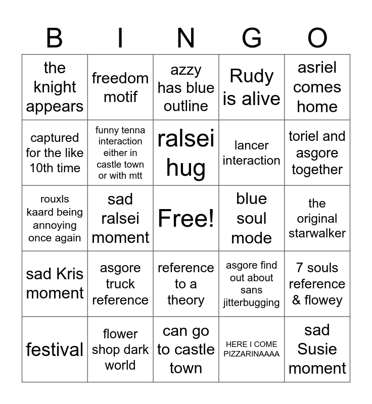 This bingo card has a free space and 24 words: asgore truck reference, flower shop dark world, ralsei hug, festival, asriel comes home, the knight appears, captured for the like 10th time, freedom motif, blue soul mode, reference to a theory, lancer interaction, rouxls kaard being annoying once again, asgore find out about sans jitterbugging, 7 souls reference & flowey, funny tenna interaction either in castle town or with mtt, HERE I COME PIZZARINAAAA, the original starwalker, azzy has blue outline, toriel and asgore together, sad ralsei moment, sad Susie moment, sad Kris moment, Rudy is alive and can go to castle town.