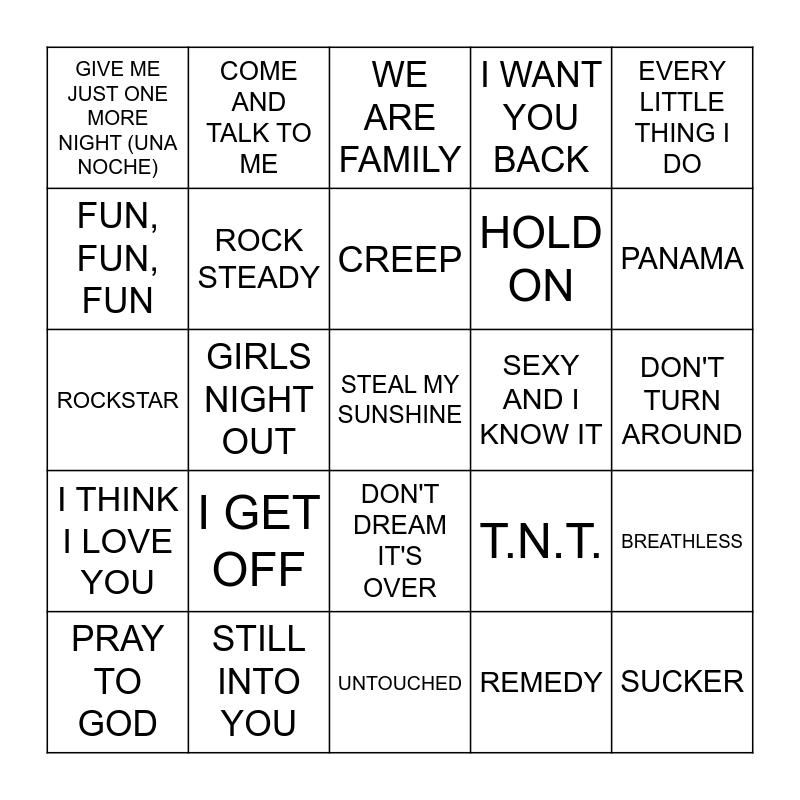 This bingo card has 64 words: AUTOMATIC, BAD MOON RISING, BE MY BABY, BREATHLESS, CLOSER, CLOSER TO THE EDGE, COME AND TALK TO ME, COWBOY TAKE ME AWAY, CREEP, CRUSH ON YOU, DON'T DREAM IT'S OVER, DON'T LOOK BACK IN ANGER, DON'T TURN AROUND, EVERY LITTLE THING I DO, EVERYDAY PEOPLE, FUN, FUN, FUN, GIRLS NIGHT OUT, GIVE ME JUST ONE MORE NIGHT (UNA NOCHE), HAVING A PARTY, HOLD ON, I GET OFF, I THINK I LOVE YOU, I WANT YOU BACK, I'M GONNA BE (500 MILES), IF I DIE YOUNG, IF LOOKS COULD KILL, INTERSTATE LOVE SONG, JIVE TALKIN', LIFESTYLES OF THE RICH AND FAMOUS, MIDNIGHT TRAIN TO GEORGIA, MMMBOP, MOUNTAIN MUSIC, MY OWN WORST ENEMY, NO ONE LIKE YOU, PANAMA, PRAY TO GOD, RAMBLIN' MAN, REMEDY, RHYTHM OF THE NIGHT, ROCK STEADY, ROCKSTAR, SEXY AND I KNOW IT, SHINE, SHOUT, STAY A LITTLE LONGER, STEAL MY SUNSHINE, STILL INTO YOU, SUCKER, T.N.T., THE CHILLS, THE WAY YOU DO THE THINGS YOU DO, TOP OF THE WORLD, UNTOUCHED, USE SOMEBODY, WAKE UP LITTLE SUSIE, WALK OF LIFE, WE ARE FAMILY, WELCOME TO THE BLACK PARADE, WHAT YOU NEED, WHIP IT, YOU AIN'T SEE NOTHING YET, YOU DROPPED A BOMB ON ME, YOU GOT IT (THE RIGHT STUFF) and YOU REALLY GOT ME.
