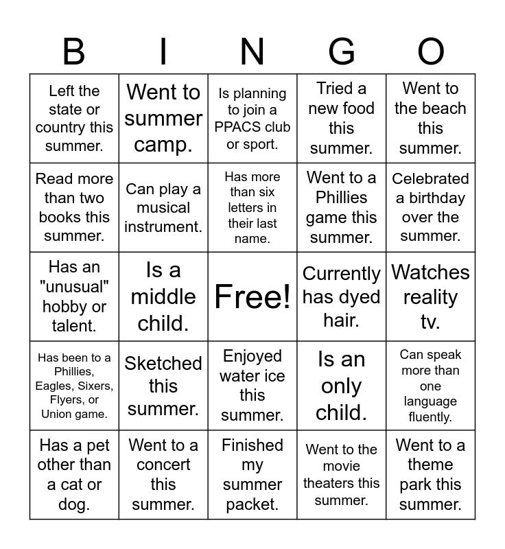 This bingo card has a free space and 24 words: Sketched this summer., Went to a concert this summer., Has more than six letters in their last name., Has a pet other than a cat or dog., Went to the beach this summer., Left the state or country this summer., Read more than two books this summer., Went to summer camp., Currently has dyed hair., Enjoyed water ice this summer., Went to a Phillies game this summer., Has an "unusual" hobby or talent., Is an only child., Can speak more than one language fluently., Can play a musical instrument., Went to the movie theaters this summer., Watches reality tv., Is planning to join a PPACS club or sport., Celebrated a birthday over the summer., Is a middle child., Went to a theme park this summer., Has been to a Phillies, Eagles, Sixers, Flyers, or Union game., Tried a new food this summer. and Finished my summer packet..