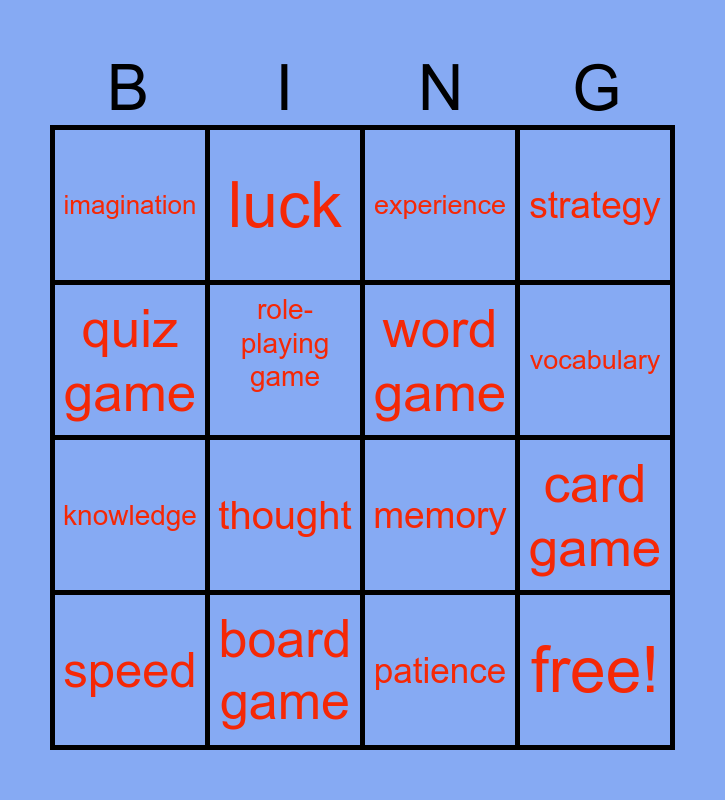 This bingo card has 16 words: board game, card game, experience, imagination, knowledge, luck, memory, patience, quiz game, role-playing game, speed, strategy, thought, vocabulary, word game and free!.