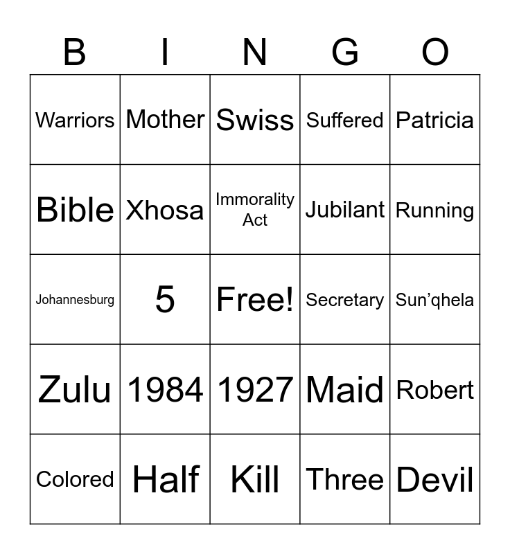 This bingo card has a free space and 29 words: Colored, Apart, 5, Thinkers, Warriors, Swiss, Xhosa, 1984, Secretary, Half, Sun’qhela, Devil, Kill, Three, Running, Beetle, 1927, Zulu, Patricia, Johannesburg, Maid, Blessings, Jubilant, Bible, Suffered, Mother, Robert, Immorality Act and Longer.