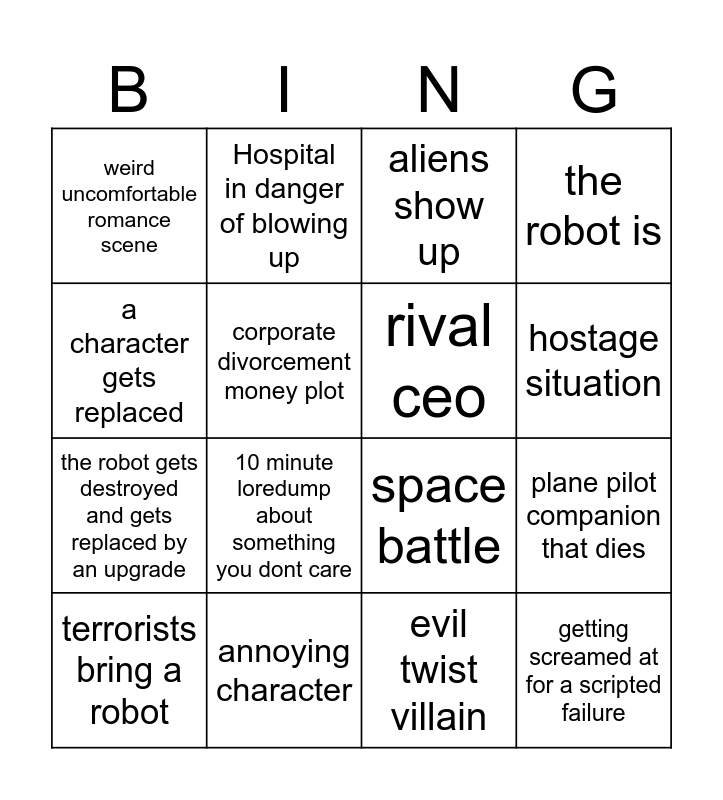 This bingo card has 16 words: annoying character, plane pilot companion that dies, aliens show up, weird uncomfortable romance scene, the robot gets destroyed and gets replaced by an upgrade, Hospital in danger of blowing up, space battle, evil twist villain, a character gets replaced, corporate divorcement money plot, terrorists bring a robot, the robot is, 10 minute loredump about something you dont care, hostage situation, rival ceo and getting screamed at for a scripted failure.