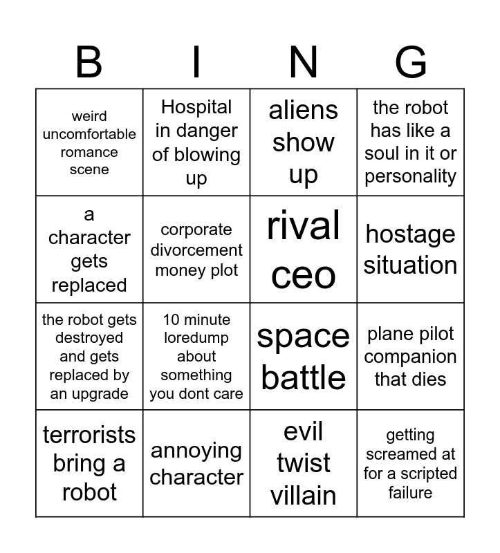 This bingo card has 16 words: annoying character, plane pilot companion that dies, aliens show up, weird uncomfortable romance scene, the robot gets destroyed and gets replaced by an upgrade, Hospital in danger of blowing up, space battle, evil twist villain, a character gets replaced, corporate divorcement money plot, terrorists bring a robot, the robot has like a soul in it or personality, 10 minute loredump about something you dont care, hostage situation, rival ceo and getting screamed at for a scripted failure.