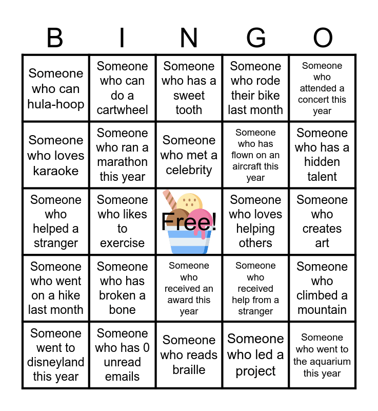 This bingo card has a free space and 24 words: Someone who has broken a bone, Someone who has 0 unread emails, Someone who met a celebrity, Someone went to disneyland this year, Someone who attended a concert this year, Someone who can hula-hoop, Someone who loves karaoke, Someone who can do a cartwheel, Someone who loves helping others, Someone who received an award this year, Someone who has flown on an aircraft this year, Someone who helped a stranger, Someone who received help from a stranger, Someone who climbed a mountain, Someone who ran a marathon this year, Someone who led a project, Someone who creates art, Someone who has a sweet tooth, Someone who has a hidden talent, Someone who likes to exercise, Someone who went to the aquarium this year, Someone who went on a hike last month, Someone who rode their bike last month and Someone who reads braille.