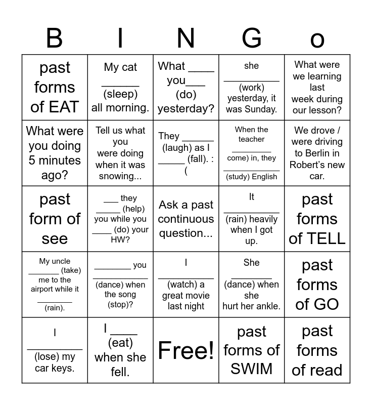 This bingo card has 25 words: My uncle _______ (take) me to the airport while it ________ (rain)., I ____ (eat) when she fell., Ask a past continuous question..., past forms of SWIM, What were we learning last week during our lesson?, past forms of EAT, My cat ______ (sleep) all morning., What ____ you___ (do) yesterday?, It ___________ (rain) heavily when I got up., past forms of GO, What were you doing 5 minutes ago?, Tell us what you were doing when it was snowing..., Free!, She ________ (dance) when she hurt her ankle., We drove / were driving to Berlin in Robert’s new car., I __________ (lose) my car keys., ___ they _____ (help) you while you ____ (do) your HW?, They ______ (laugh) as I _____ (fall). :(, When the teacher _________ come) in, they _____________ (study) English, past forms of TELL, past form of see, ________ you ____________ (dance) when the song (stop)?, I ___________ (watch) a great movie last night, she ___________ (work) yesterday, it was Sunday. and past forms of read.