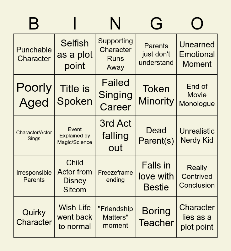 This bingo card has a free space and 24 words: Child Actor from Disney Sitcom, Wish Life went back to normal, Failed Singing Career, Quirky Character, Unearned Emotional Moment, Punchable Character, Poorly Aged, Selfish as a plot point, Dead Parent(s), Freezeframe ending, Token Minority, Character/Actor Sings, Falls in love with Bestie, Really Contrived Conclusion, Title is Spoken, Boring Teacher, Unrealistic Nerdy Kid, Supporting Character Runs Away, End of Movie Monologue, Event Explained by Magic/Science, Character lies as a plot point, Irresponsible Parents, Parents just don't understand and "Friendship Matters" moment.