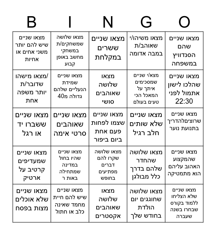 This bingo card has a free space and 24 words: מצאו שניים שהיו בחול במדינה שמתחילה באות ר, מצאו שניים שיש להם חיית מחמד שאינה כלב או חתול, מצאו שלושה שאוהבים סושי, מצאו שניים שלא אוכלים מצות בפסח, מצאו שניים שהם הסנדוויץ במשפחה, מצאו שניים שיש להם יותר משני אחים או אחיות, מצאו מישהו/ שדובר/ת יותר משפה אחת, מצאו שלושה שמשחקים/ת במשחקי מחשב באופן קבוע, מצאו שניים שלא שותים חלב רגיל, מצאו שלושה שקרו להם דברים מפתיעים בחופש, מצא/י שניים שמסכימים איתך על המאכל הכי טעים בעולם, מצאו שניים ששברו יד או רגל, מצאו שלושה שהחדר שלהם בדרך כלל מבולגן, מצאו שניים שהמקצוע האהוב עליהם הוא מתמטיקה, מצאו שניים שמידת הנעליים שלהם גדולה מ40, מצאו שלושה שחוגגים יום הולדת בחודש שלך, מצאו שניים שרוציםלהדריך בתנועת נוער, מצאו שניים ששרים במקלחת, מצאו שניים שהלכו לישון אתמול לפני 22:30, מצאו שניים שאוהבים סרטי אימה, מצאו שניים שלא הצליחו ללמוד בקורס שבחרו בשנה שעברה, מצאו שניים שמעדיפים קרטיב על ארטיק, מצאו משיהו/י שאוהב/ת במבה אדומה and מצאו שלושה שאוהבים אקסטרים.
