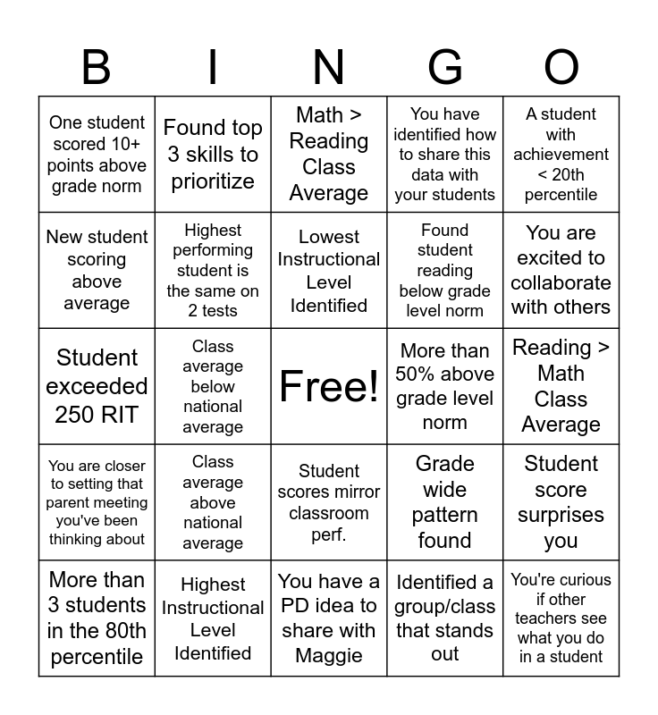 This bingo card has a free space and 24 words: Class average above national average, Highest Instructional Level Identified, Lowest Instructional Level Identified, More than 3 students in the 80th percentile, A student with achievement < 20th percentile, One student scored 10+ points above grade norm, New student scoring above average, Found top 3 skills to prioritize, More than 50% above grade level norm, Student scores mirror classroom perf., Found student reading below grade level norm, Student exceeded 250 RIT, Grade wide pattern found, Student score surprises you, Highest performing student is the same on 2 tests, Identified a group/class that stands out, Reading > Math Class Average, Math > Reading Class Average, You are excited to collaborate with others, Class average below national average, You're curious if other teachers see what you do in a student, You are closer to setting that parent meeting you've been thinking about, You have identified how to share this data with your students and You have a PD idea to share with Maggie.
