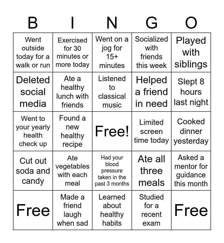 This bingo card has a free space and 24 words: Ate vegetables with each meal, Made a friend laugh when sad, Listened to classical music, Free, Played with siblings, Went outside today for a walk or run, Deleted social media, Exercised for 30 minutes or more today, Limited screen time today, Had your blood pressure taken in the past 3 months, Helped a friend in need, Went to your yearly health check up, Ate all three meals, Asked a mentor for guidance this month, Ate a healthy lunch with friends, Studied for a recent exam, Cooked dinner yesterday, Went on a jog for 15+ minutes, Slept 8 hours last night, Found a new healthy recipe, Free, Cut out soda and candy, Socialized with friends this week and Learned about healthy habits.