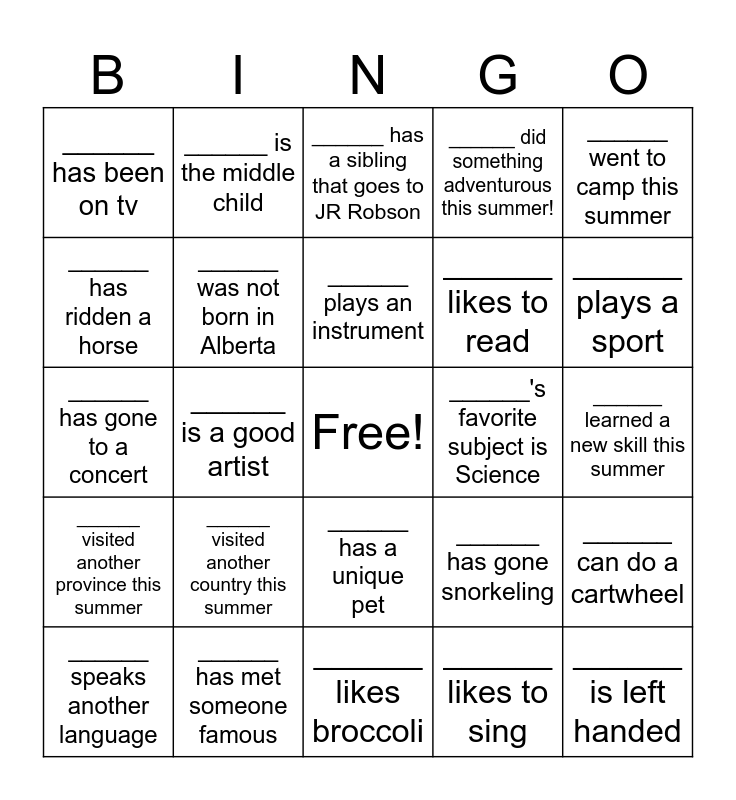 This bingo card has a free space and 24 words: ______ visited another country this summer, ______ has met someone famous, ______ plays an instrument, ______ speaks another language, ______ went to camp this summer, ______ has been on tv, ______ has ridden a horse, ______ is the middle child, ______'s favorite subject is Science, ______ has a unique pet, ______ likes to read, ______ has gone to a concert, ______ has gone snorkeling, ______ can do a cartwheel, ______ was not born in Alberta, ______ likes to sing, ______ learned a new skill this summer, ______ has a sibling that goes to JR Robson, ______ plays a sport, ______ is a good artist, ______ is left handed, ______ visited another province this summer, ______ did something adventurous this summer! and ______ likes broccoli.