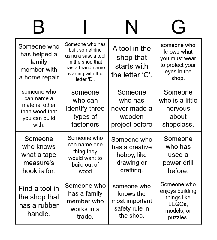 This bingo card has 16 words: Someone who has a family member who works in a trade., Someone who has used a power drill before., A tool in the shop that starts with the letter ‘C'., Someone who has helped a family member with a home repair, Someone who knows what a tape measure's hook is for., Someone who has built something using a saw. a tool in the shop that has a brand name starting with the letter 'D'., Someone who has a creative hobby, like drawing or crafting., someone who knows the most important safety rule in the shop., someone who can name a material other than wood that you can build with., someone who can identify three types of fasteners, Find a tool in the shop that has a rubber handle., someone who knows what you must wear to protect your eyes in the shop., Someone who can name one thing they would want to build out of wood, Someone who is a little nervous about shopclass., Someone who has never made a wooden project before and Someone who enjoys building things like LEGOs, models, or puzzles..