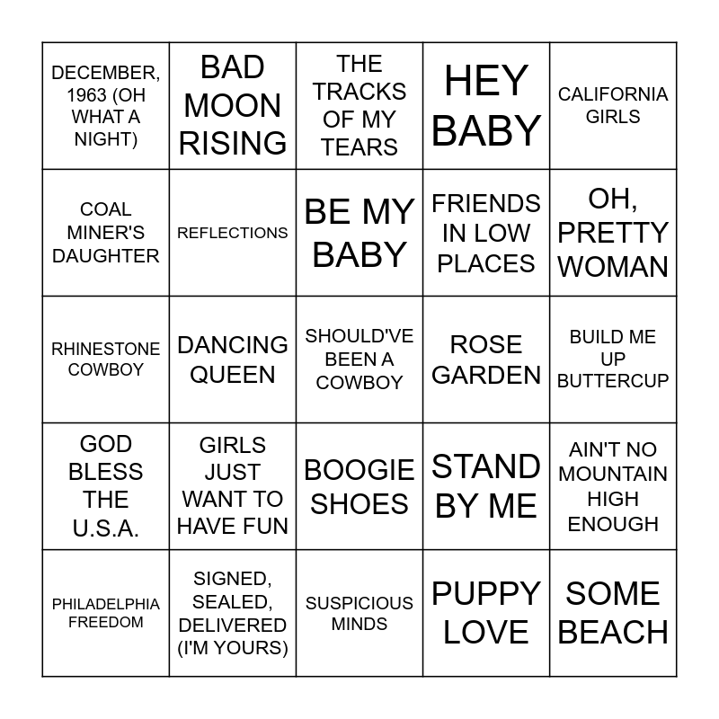 This bingo card has 64 words: (SITTIN' ON) THE DOCK OF THE BAY, ACHY BREAKY HEART, AFRICA, AIN'T NO MOUNTAIN HIGH ENOUGH, ALCOHOL, AT THE HOP, BAD MOON RISING, BAD, BAD LEROY BROWN, BE MY BABY, BILLIE JEAN, BOOGIE SHOES, BREAKING UP IS HARD TO DO, BUILD ME UP BUTTERCUP, CALIFORNIA GIRLS, CHATTAHOOCHEE, COAL MINER'S DAUGHTER, DANCING QUEEN, DECEMBER, 1963 (OH WHAT A NIGHT), EARTH ANGEL, FRIENDS IN LOW PLACES, GIRLS JUST WANT TO HAVE FUN, GOD BLESS THE U.S.A., HEY BABY, HEY THERE LONELY GIRL, I CAN'T HELP MYSELF (SUGAR PIE, HONEY BUNCH), I WANT TO HOLD YOUR HAND, I WAS COUNTRY WHEN COUNTRY WASN'T COOL, I'LL BE THERE, IT'S THE SAME OLD SONG, JAILHOUSE ROCK, KARMA CHAMELEON, LET YOUR LOVE FLOW, LOUIE LOUIE, MARGARITAVILLE, OH, PRETTY WOMAN, PHILADELPHIA FREEDOM, PLAY THAT FUNKY MUSIC, PUPPY LOVE, PUT YOUR HEAD ON MY SHOULDER, REFLECTIONS, RHINESTONE COWBOY, ROSE GARDEN, RUNAROUND SUE, SAVE THE LAST DANCE FOR ME, SEPTEMBER, SHOULD'VE BEEN A COWBOY, SIGNED, SEALED, DELIVERED (I'M YOURS), SOME BEACH, STAND BY ME, STAND BY YOUR MAN, STOP! IN THE NAME OF LOVE, SURFIN' U.S.A., SUSPICIOUS MINDS, SWEET CAROLINE, THE BIRDS AND THE BEES, THE DEVIL WENT DOWN TO GEORGIA, THE TRACKS OF MY TEARS, THE TWIST, TOES, UNDER THE BOARDWALK, VENUS, WAKE UP LITTLE SUSIE, YOU WILL LOVE ME TOMORROW and YOU CAN'T HURRY LOVE.