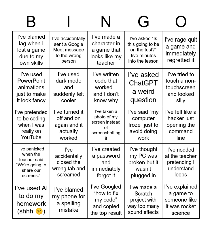 This bingo card has 25 words: I’ve accidentally closed the wrong tab and screamed, I’ve Googled “how to fix my code” and copied the top result, I’ve written code that worked... and I don’t know why, I’ve used AI to do my homework (shhh 🤫), I’ve rage quit a game and immediately regretted it, I’ve blamed lag when I lost a game due to my own skills, I’ve used PowerPoint animations just to make it look fancy, I’ve accidentally sent a Google Meet message to the wrong person, I’ve said “my computer froze” just to avoid doing work, I’ve created a password and immediately forgot it, I’ve asked ChatGPT a weird question, I’ve pretended to be coding when I was really on YouTube, I’ve thought my PC was broken but it wasn’t plugged in, I’ve nodded at the teacher pretending I understand loops, I’ve used dark mode and suddenly felt cooler, I’ve explained a game to someone like it was rocket science, I’ve felt like a hacker just opening the command line, I’ve made a character in a game that looks like my teacher, I’ve tried to touch a non-touchscreen and looked silly, I’ve turned it off and on again and it actually worked, I’ve taken a photo of my screen instead of screenshotting it, I’ve blamed my phone for a spelling mistake, I’ve panicked when the teacher said “We’re going to share our screens.”, I’ve asked “Is this going to be on the test?” five minutes into the lesson and I’ve made a Scratch project with way too many sound effects.