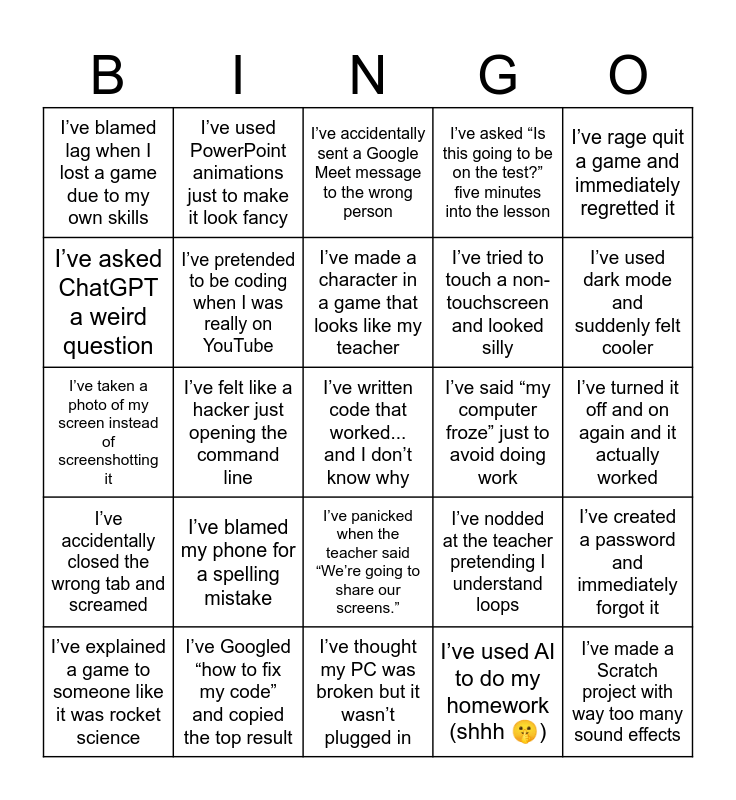 This bingo card has 25 words: I’ve accidentally closed the wrong tab and screamed, I’ve Googled “how to fix my code” and copied the top result, I’ve written code that worked... and I don’t know why, I’ve used AI to do my homework (shhh 🤫), I’ve rage quit a game and immediately regretted it, I’ve blamed lag when I lost a game due to my own skills, I’ve used PowerPoint animations just to make it look fancy, I’ve accidentally sent a Google Meet message to the wrong person, I’ve said “my computer froze” just to avoid doing work, I’ve created a password and immediately forgot it, I’ve asked ChatGPT a weird question, I’ve pretended to be coding when I was really on YouTube, I’ve thought my PC was broken but it wasn’t plugged in, I’ve nodded at the teacher pretending I understand loops, I’ve used dark mode and suddenly felt cooler, I’ve explained a game to someone like it was rocket science, I’ve felt like a hacker just opening the command line, I’ve made a character in a game that looks like my teacher, I’ve tried to touch a non-touchscreen and looked silly, I’ve turned it off and on again and it actually worked, I’ve taken a photo of my screen instead of screenshotting it, I’ve blamed my phone for a spelling mistake, I’ve panicked when the teacher said “We’re going to share our screens.”, I’ve asked “Is this going to be on the test?” five minutes into the lesson and I’ve made a Scratch project with way too many sound effects.