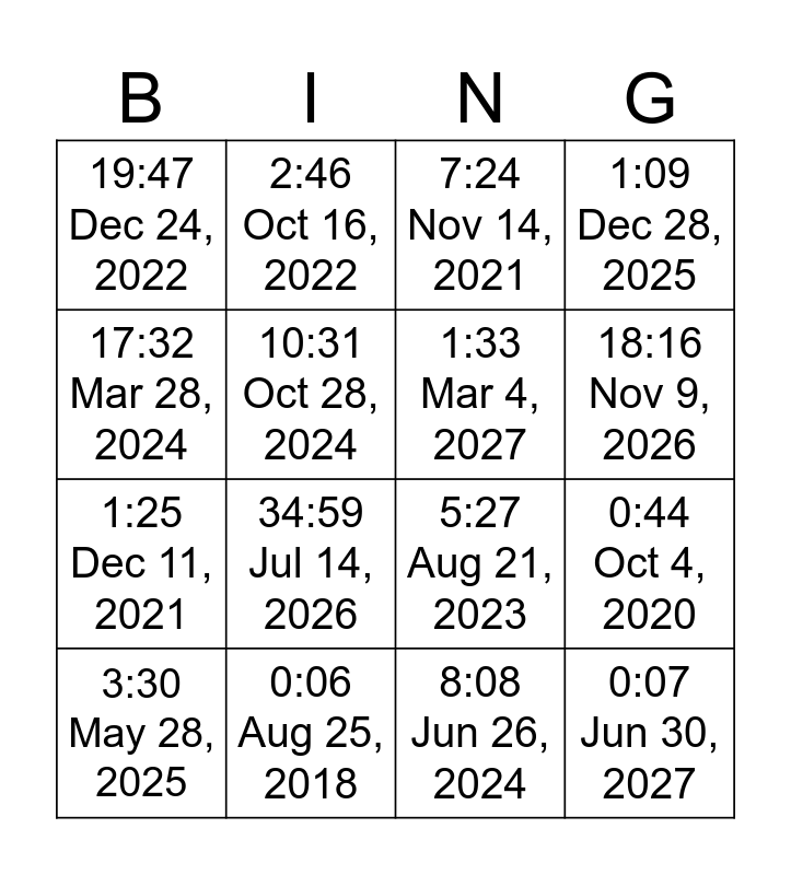 This bingo card has 16 words: 0:06 Aug 25, 2018, 0:44 Oct 4, 2020, 7:24 Nov 14, 2021, 19:47 Dec 24, 2022, 1:25 Dec 11, 2021, 2:46 Oct 16, 2022, 5:27 Aug 21, 2023, 8:08 Jun 26, 2024, 17:32 Mar 28, 2024, 10:31 Oct 28, 2024, 3:30 May 28, 2025, 1:09 Dec 28, 2025, 34:59 Jul 14, 2026, 18:16 Nov 9, 2026, 1:33 Mar 4, 2027 and 0:07 Jun 30, 2027.