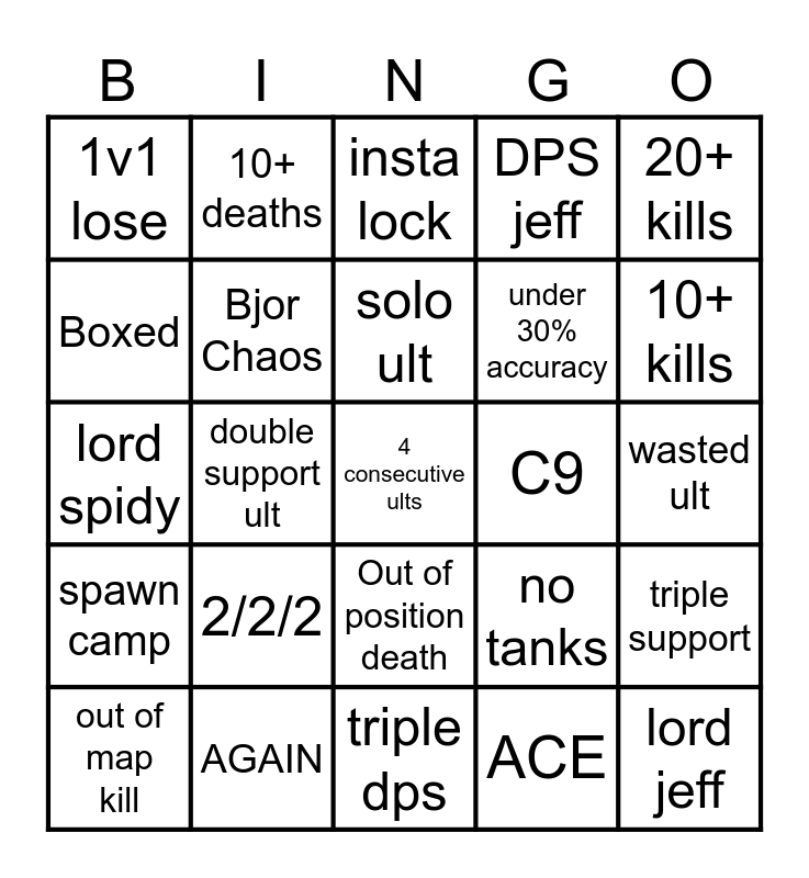 This bingo card has 25 words: 2/2/2, triple dps, solo ult, out of map kill, 20+ kills, 1v1 lose, Boxed, 10+ deaths, C9, Out of position death, under 30% accuracy, lord spidy, no tanks, triple support, Bjor Chaos, lord jeff, wasted ult, insta lock, 10+ kills, double support ult, 4 consecutive ults, AGAIN, spawn camp, DPS jeff and ACE.